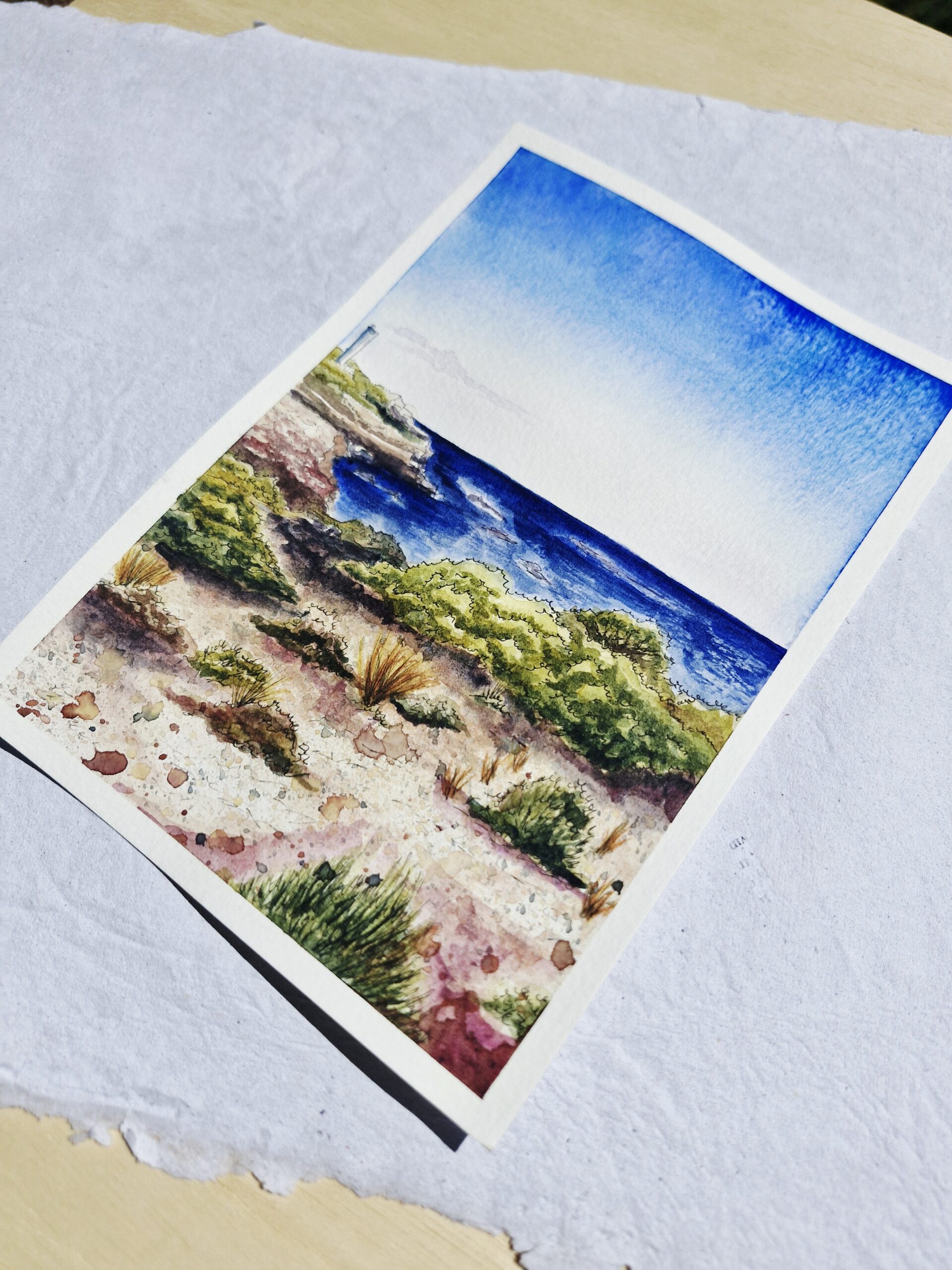Over the course of the next year I balanced the early years of my career with dedicating time to building a mini portfolio of sorts. Painting beach scenes, cityscapes and outback landscapes in watercolour. During that time I took note of landscapes I enjoyed painting the most, brushes and techniques that worked best for me and of colours I found myself 'drawn' to. Excuse the pun. My work evolved and I redicovered my love of colour and form. I discovered my artistic style in this time and found that it was quite maximalist, incorporating vibrant colours and loud details.